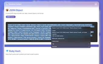 Render Selected Text är en kraftfull Chrome-tillägg som gör det möjligt att visualisera och utforska JSON, Ruby-hashar, PHP-arrayer och HTML direkt i webbläsaren. Med en användarvänlig och modern design erbjuder det en interaktiv JSON-trädvy där användare enkelt kan expandera och kollapsa inbäddade objekt och arrayer. Dessutom har den stöd för flera format och erbjuder syntaxmarkering för att enkelt särskilja olika datatyper.